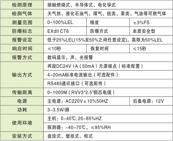可燃气体检测报警装置技术参数