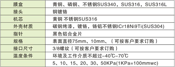 微压表由测量系统(包括接头、波纹膜盒等)、传动机构(包括拔杆机构、齿轮转动机构)、指示部件(包括指骨与度盘)和外壳(包括表壳、衬圈和表玻璃)所组成。微压表的工作原理呈基于波纹金属膜盒在被测介质的压力作用下,其自由端产生相应的弹性变形,再经齿轮转动机构的转动并放大,由固定于齿轮轴上的指针逐将测值在度盘上指示出来,还有调零装置,可以方便将指针调整到零位。膜盒压力表之所以压力敏感元件呈由两块波浪型的金属膜片组成,故称之为膜盒压力表;但它与一般压力表不同之处就在与它能够准确测较为微小的压力,故又称微压表,台湾称之为水柱表或微压计。应用:此款压力表为台湾产品,溶专业的技术,选高质材料精制而成,广泛用于管道终端用气压力显示。适用于测量液化石油气、天然气、空气等对铜合金不起腐蚀作用的气体的微压和负压;该产品应用于燃气设备、热能设备、涂装设备和各式工业燃气加热系统、煤气管道工程上,如调压箱、燃烧器、锅炉、烤炉、烘箱、厨具等工业设备用气测量显示仪表。